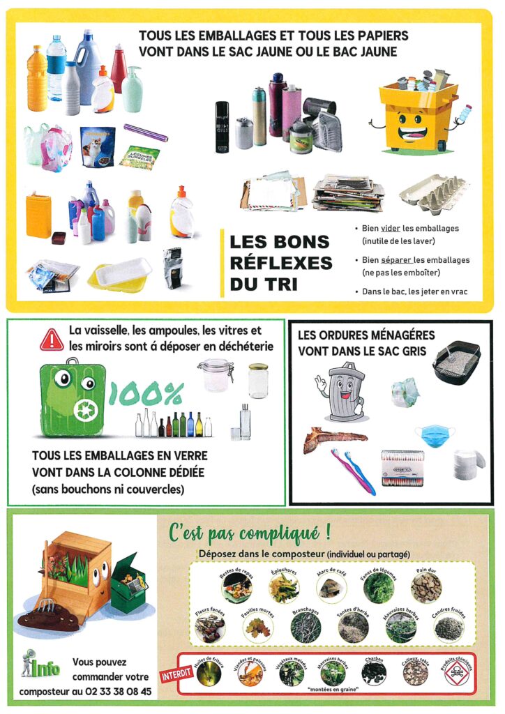 Les ordures ménagères, le tri sélectifs et les déchetteries sont de la compétence de la Communauté de Communes Andaine-Passais, située à Juvigny Val d’Andaine et Passais Village: